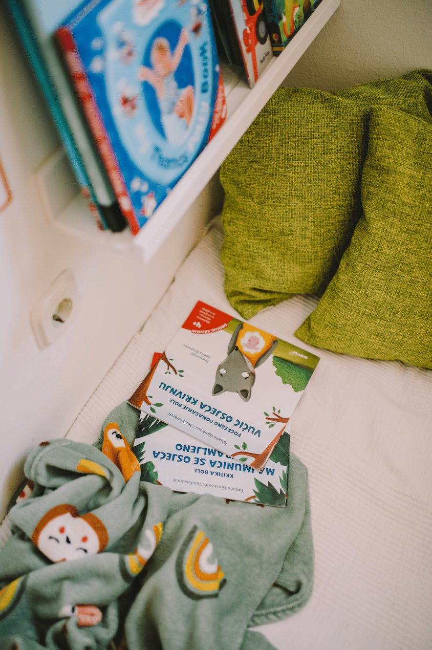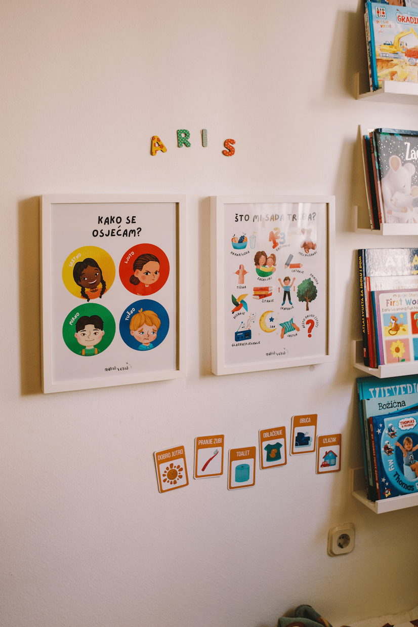 Naš mirni kutak, obogaćen je slikovnicama, jastučićima, senzornom košaricom i posterima s kojima moj mališan ima dnevnu interakciju. Ponekad samo da mi pomaže kako se osjeća, a ponekad da zatraži moju pomoć da se umiri.